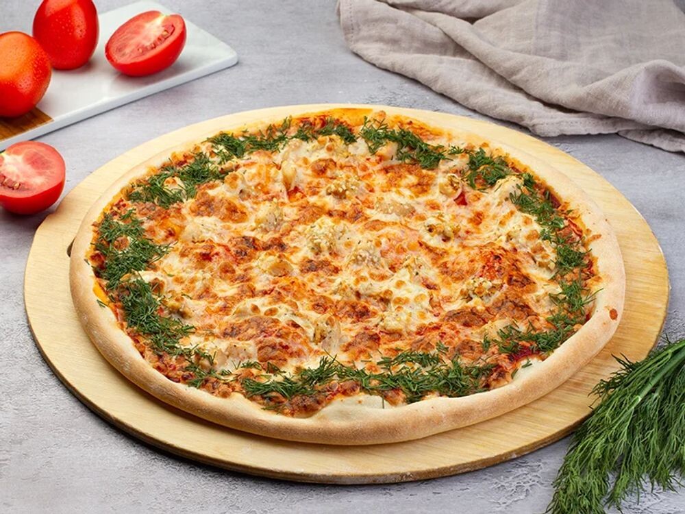 Куриное филе, сыр моцарелла, соус томатный, соус маджорио, укроп