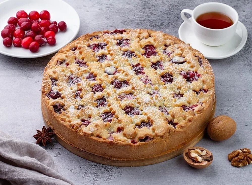 Ароматное тесто, приготовленное с добавлением корицы и мускатного ореха, сочетается с насыщенной начинкой из клюквы и грецких орехов. Клюква придает пирогу кислинку и витамины, а орехи - хруст и белок