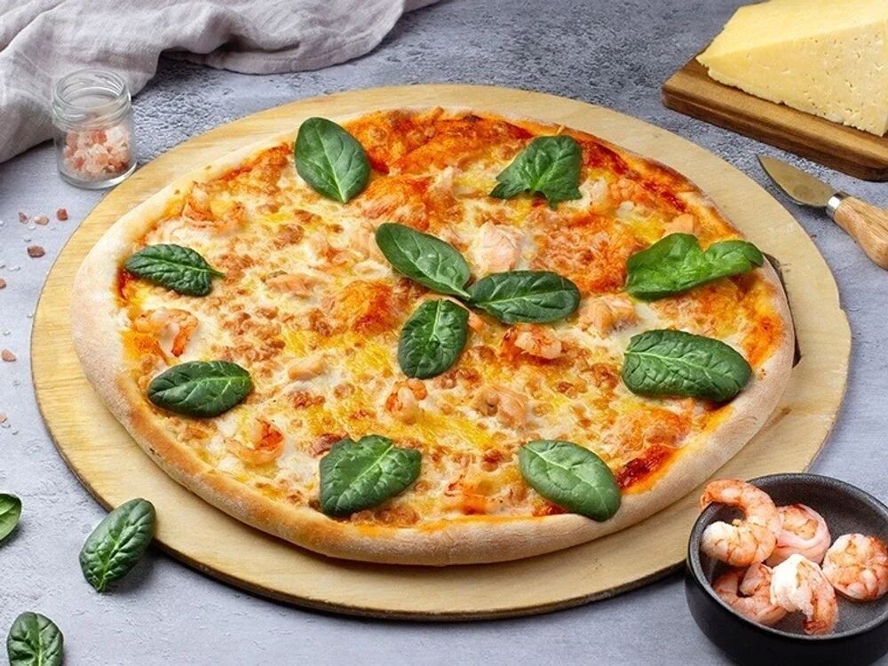 Настоящий кулинарный шедевр, который отражает нашу фирменную философию. Она начинается с нашего особого теста для пиццы, покрытого ароматным соусом. Затем добавляются слои нежного сыра моцарелла, свежего филе лосося и сочных тигровых креветок. Все это украшено свежим салатом руккола, который придает пицце легкость и свежесть
