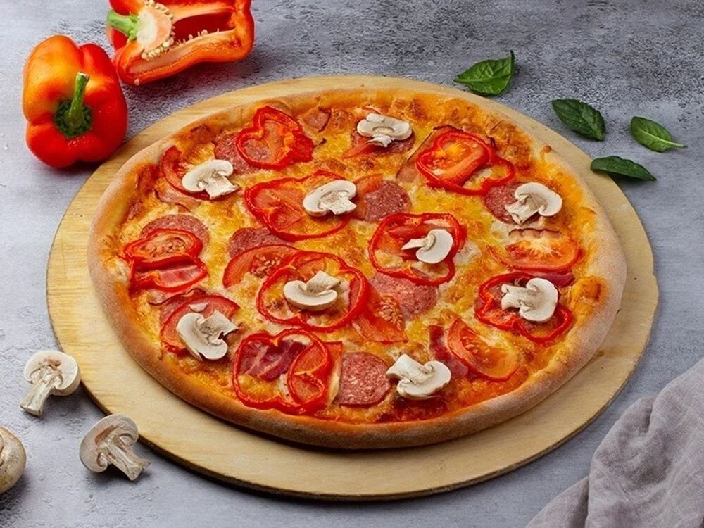 Пицца начинается с ароматного соуса, на который укладываются ломтики салями и бекона. Грибы шампиньоны и болгарский перец добавляют нотку свежести, а помидоры и сыр моцарелла создают идеальное сочетание вкусов