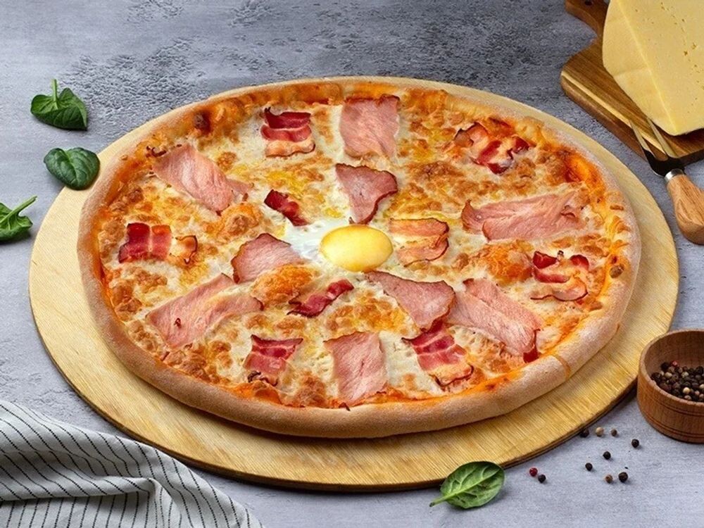 Пицца начинается с ароматного бекона и сочного карбонада, которые вместе создают неповторимый вкус. Сыр моцарелла добавляет нежности и кремовости, а яйцо придает пицце уникальный вкус и текстуру