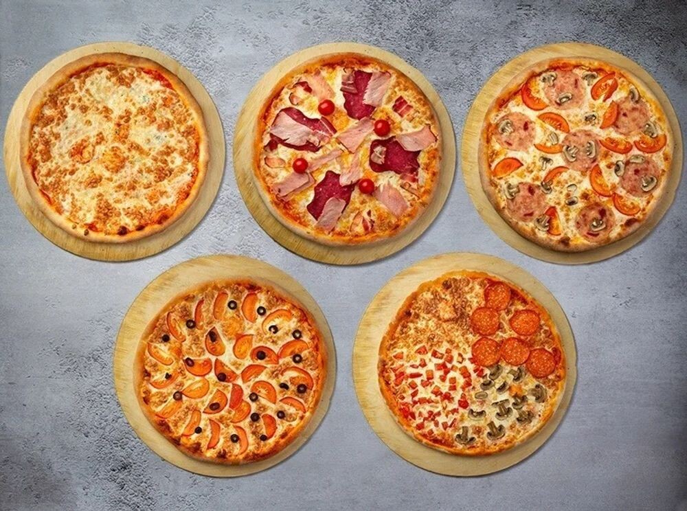 Пицца «Четыре сыра», пицца «Маргарита», пицца «Мясная, пицца «Римская», пицца «Четыре сезона»